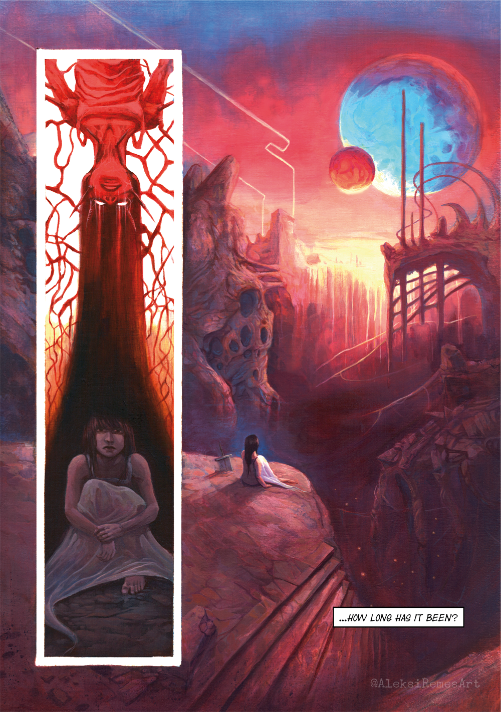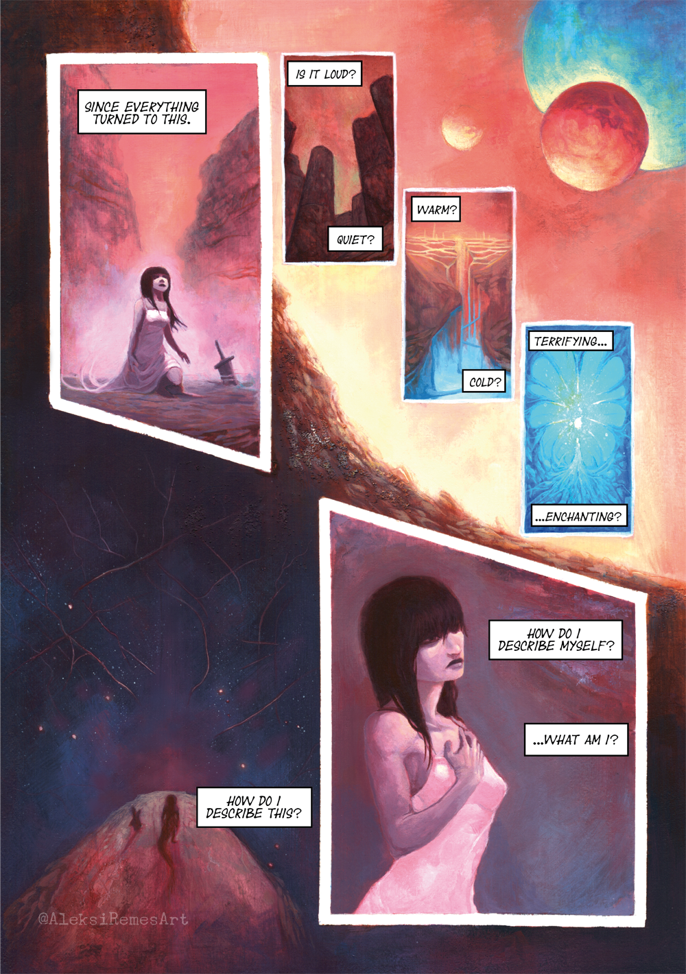 The first five pages from a personal comic project. The project has been supported by artist grants from Sarjakuvantekijät ry. and WSOY:n kirjallisuussäätiö. Done with acrylic paint. Edits and text done in Photoshop and Illustrator.